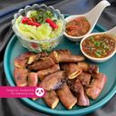 Grilled pork small intestines set with vegetables, our special house-made sauce, and refreshing Oishi black tea